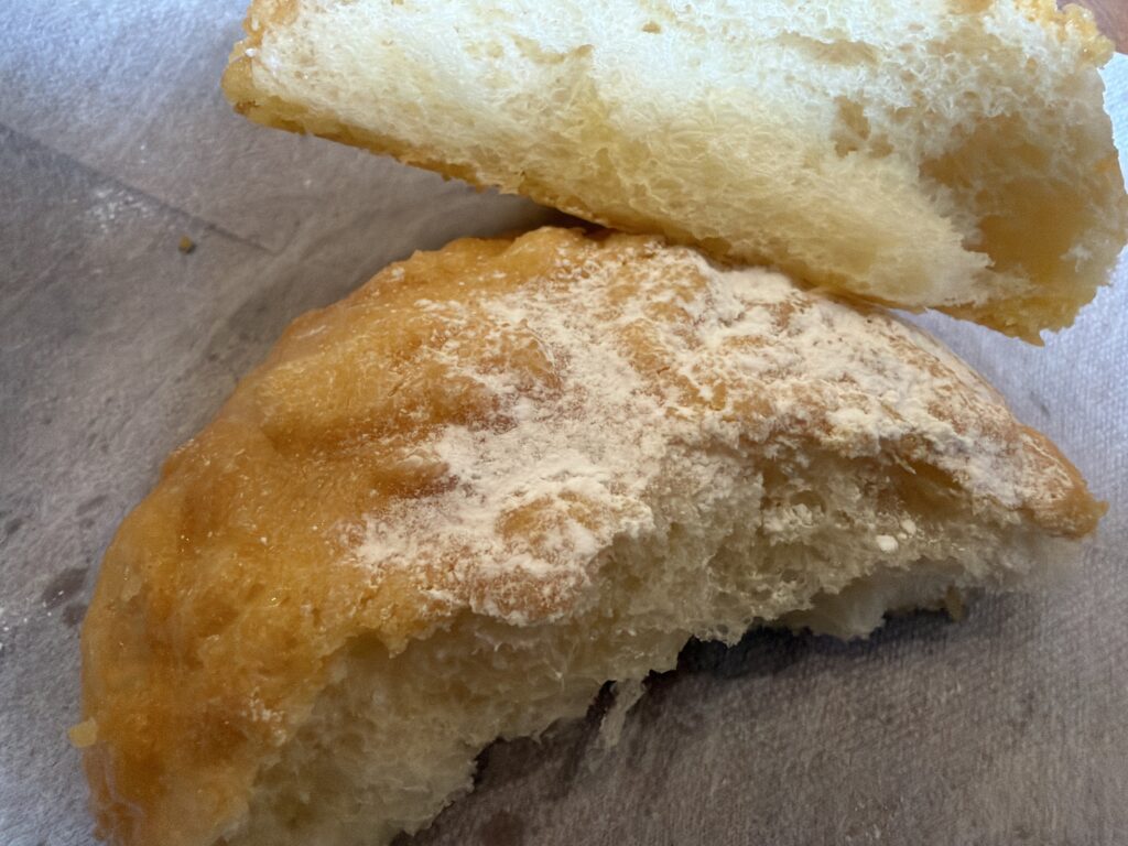 肝心のパンについて少し書きます。まずは、この「メロンパン」です。まるで「わたあめ」を食べるような軽く、ほんのり甘い食感が面白い一品で見た目とのギャップがあります。なんといっても「193円」という価格設定がシュールな印象です。